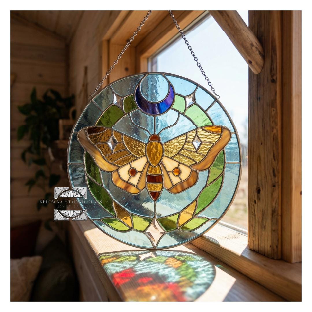 Add mystical charm to your glass art with this Stained Glass Moth, Moon, and Stars Pattern, available in two round sizes: 8.3 inches (21 cm) and 10.5 inches (26.7 cm). Designed for intermediate crafters, this digital pattern features an enchanting moth surrounded by a crescent moon and twinkling stars—perfect for sun catchers, window panels, or celestial-inspired gifts.