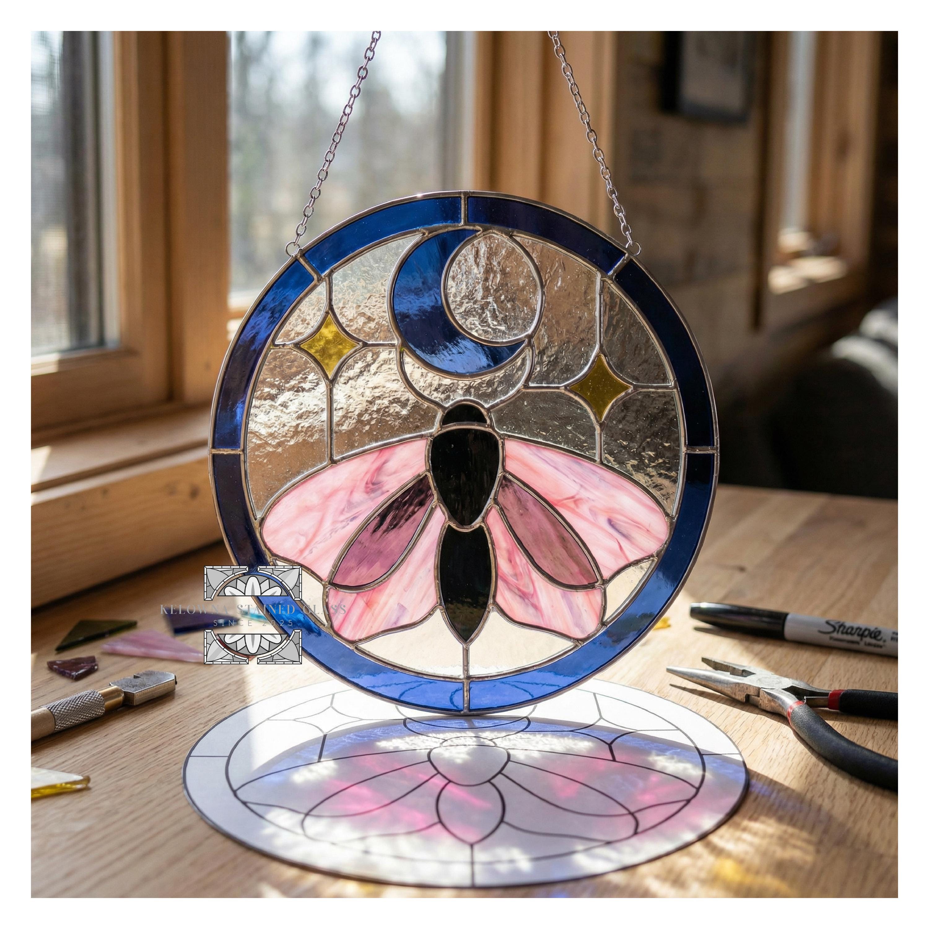 Magical moth, moon, and star design for celestial stained-glass projects.