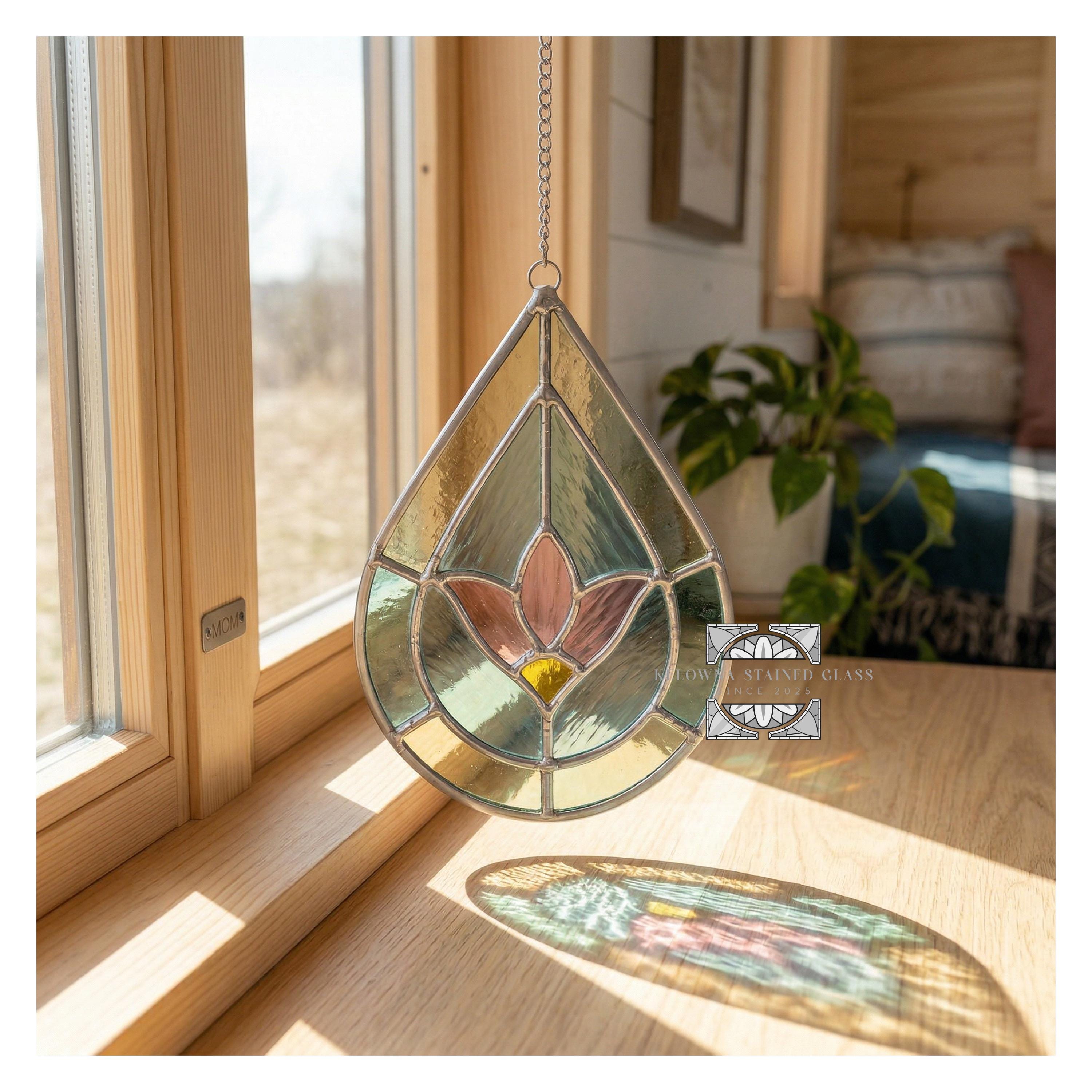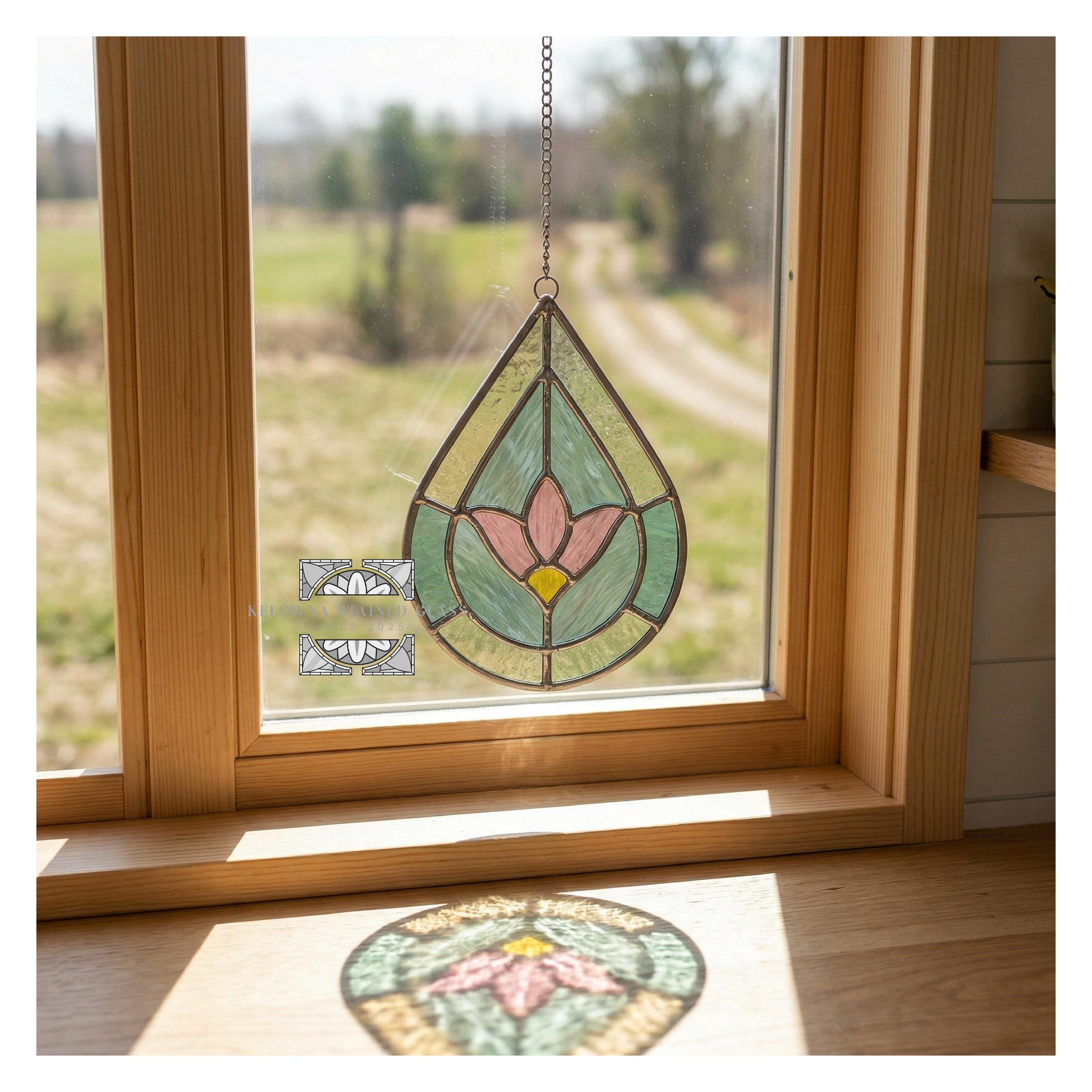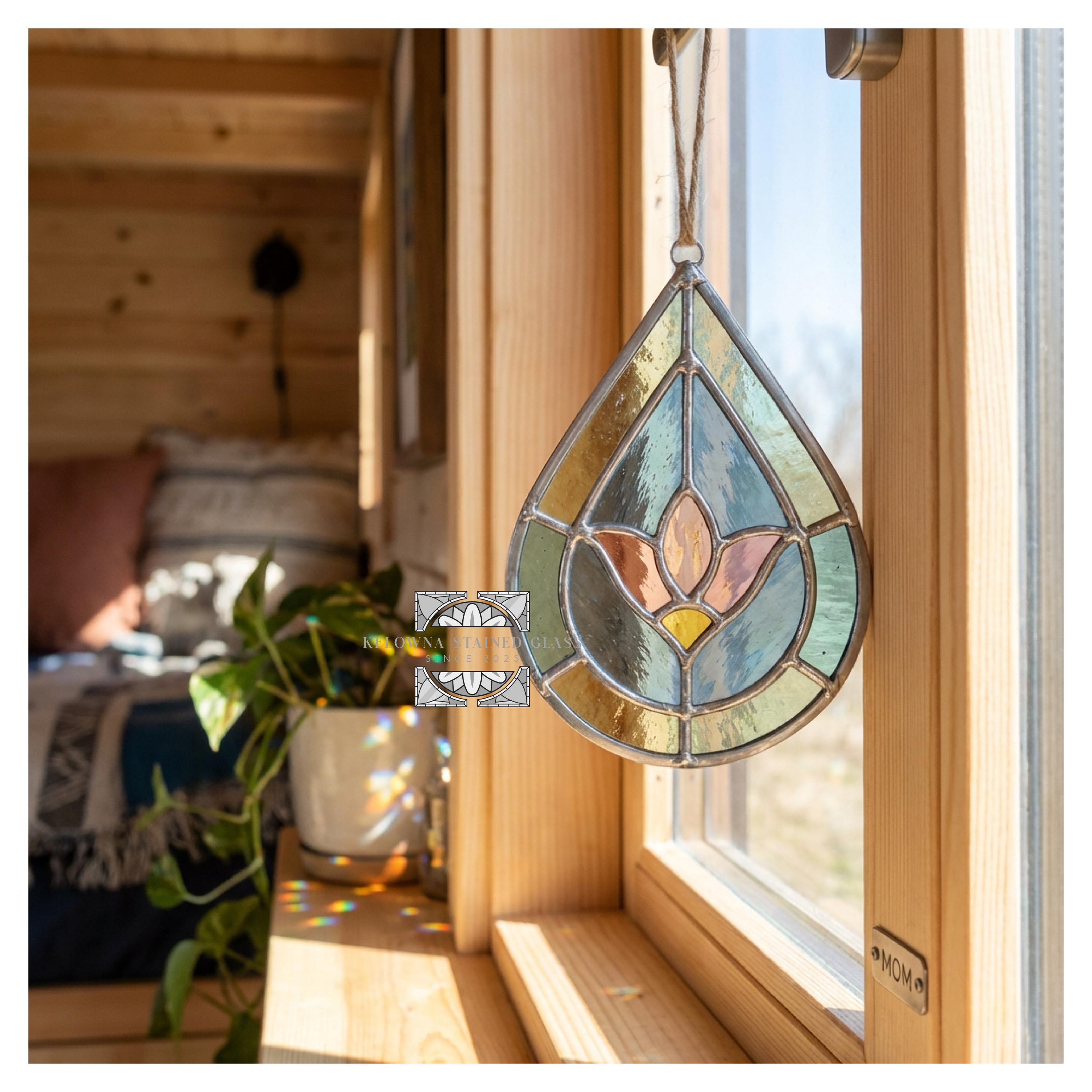 Elegant flower design in a modern drop shape—ideal for spring decor, garden lovers, or floral-themed stained glass art
