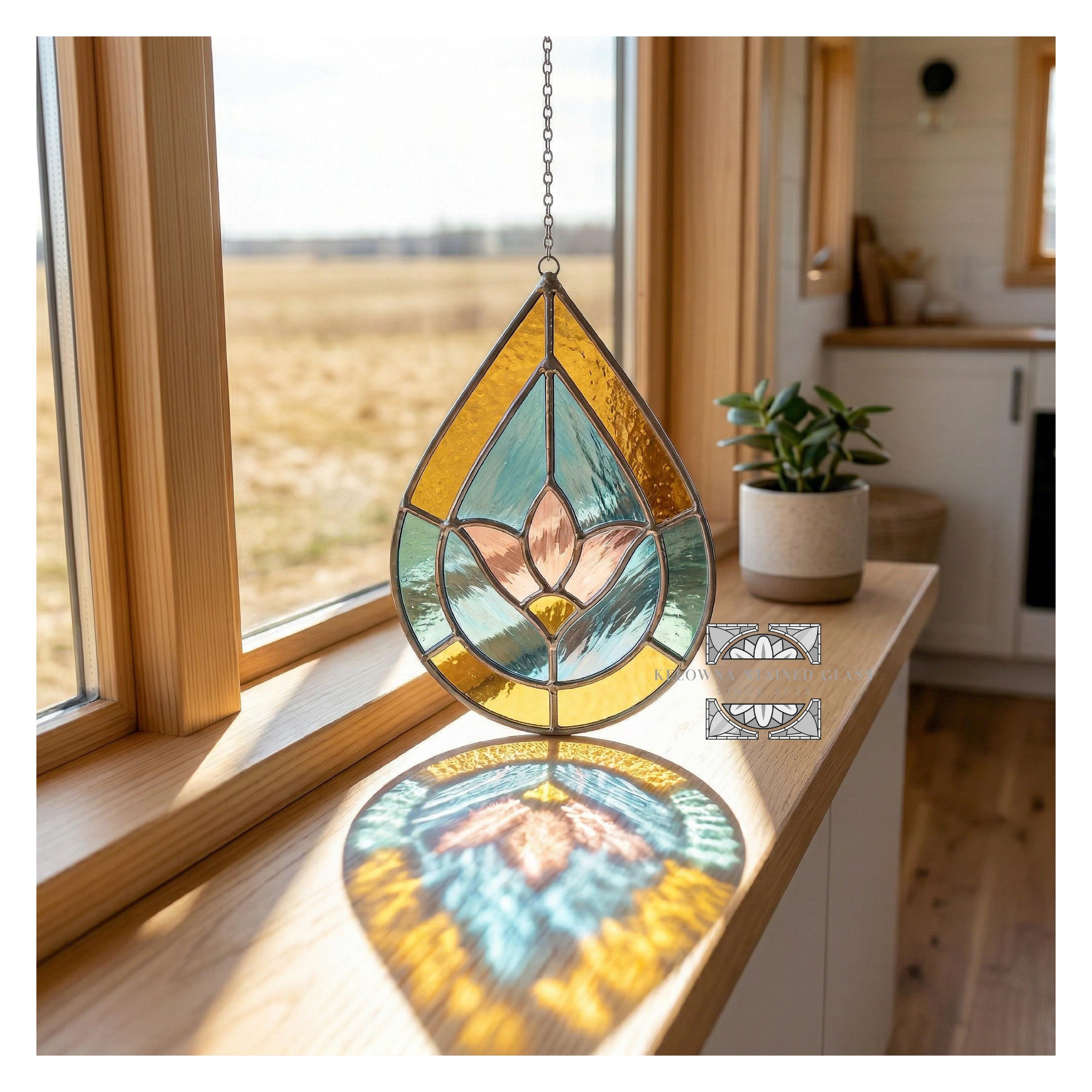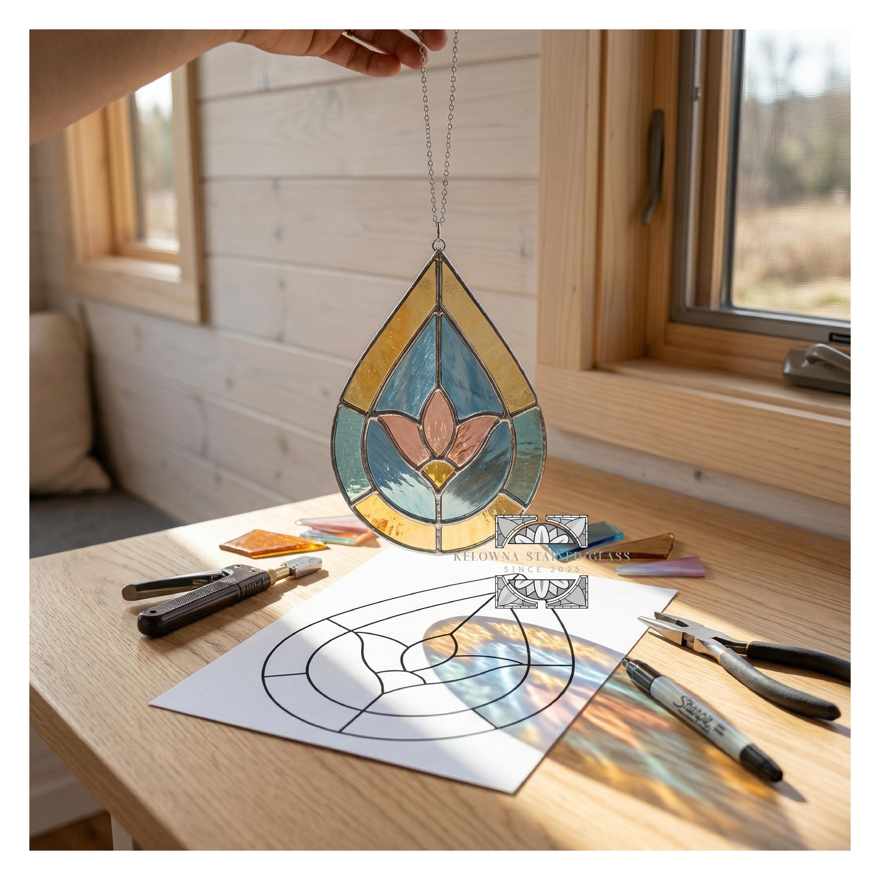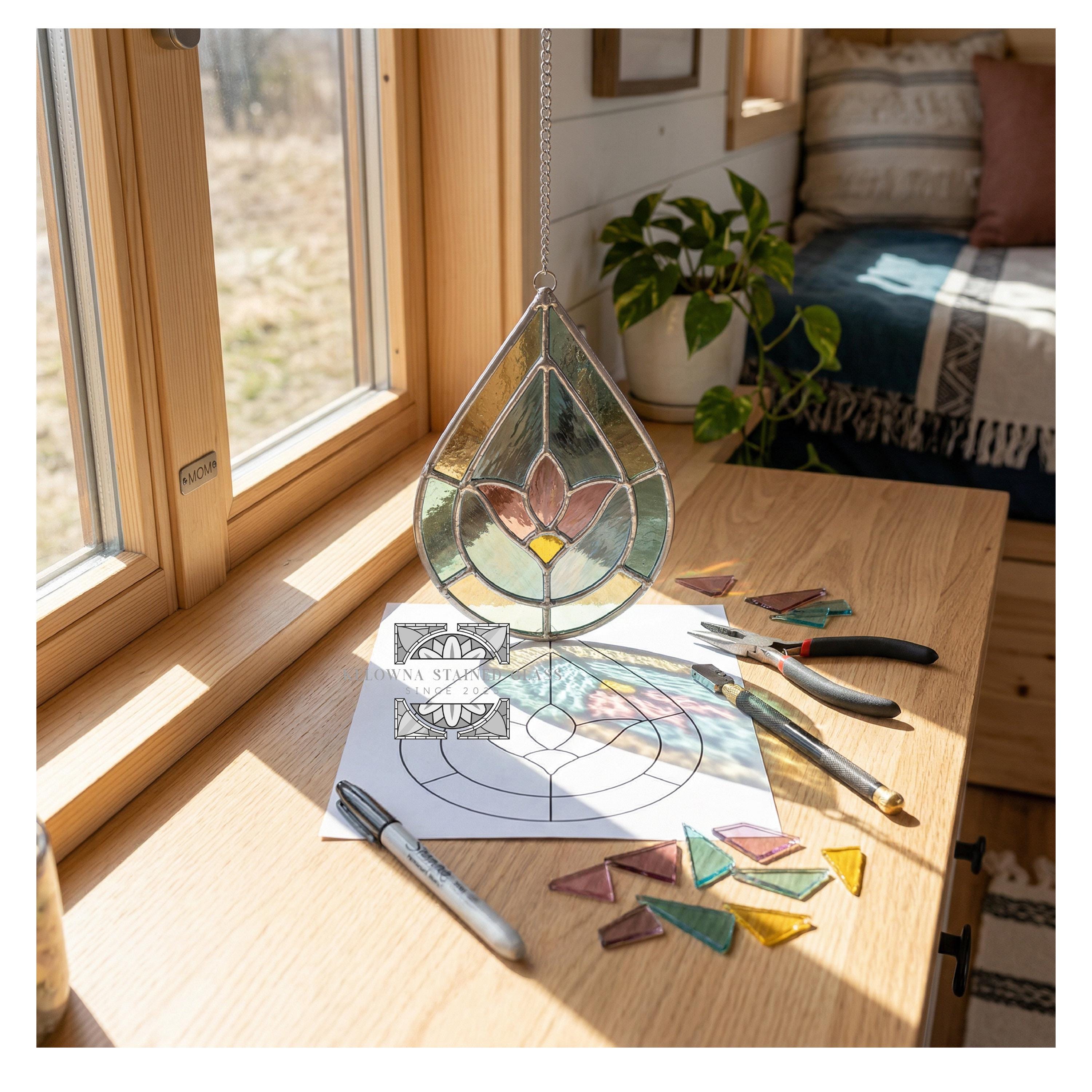 Elegant flower design in a modern drop shape—ideal for spring decor, garden lovers, or floral-themed stained glass art